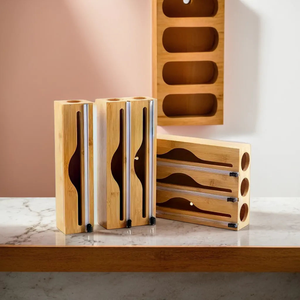 Håll ditt kök snyggt och ordnat med vår Bamboo WrapNest. Denna eleganta bambulåda rymmer plastfolie, aluminiumfolie och vaxpapper, och passar perfekt i lådor eller på väggen. Med den inbyggda skäraren får du alltid ett rent snitt utan krångel.