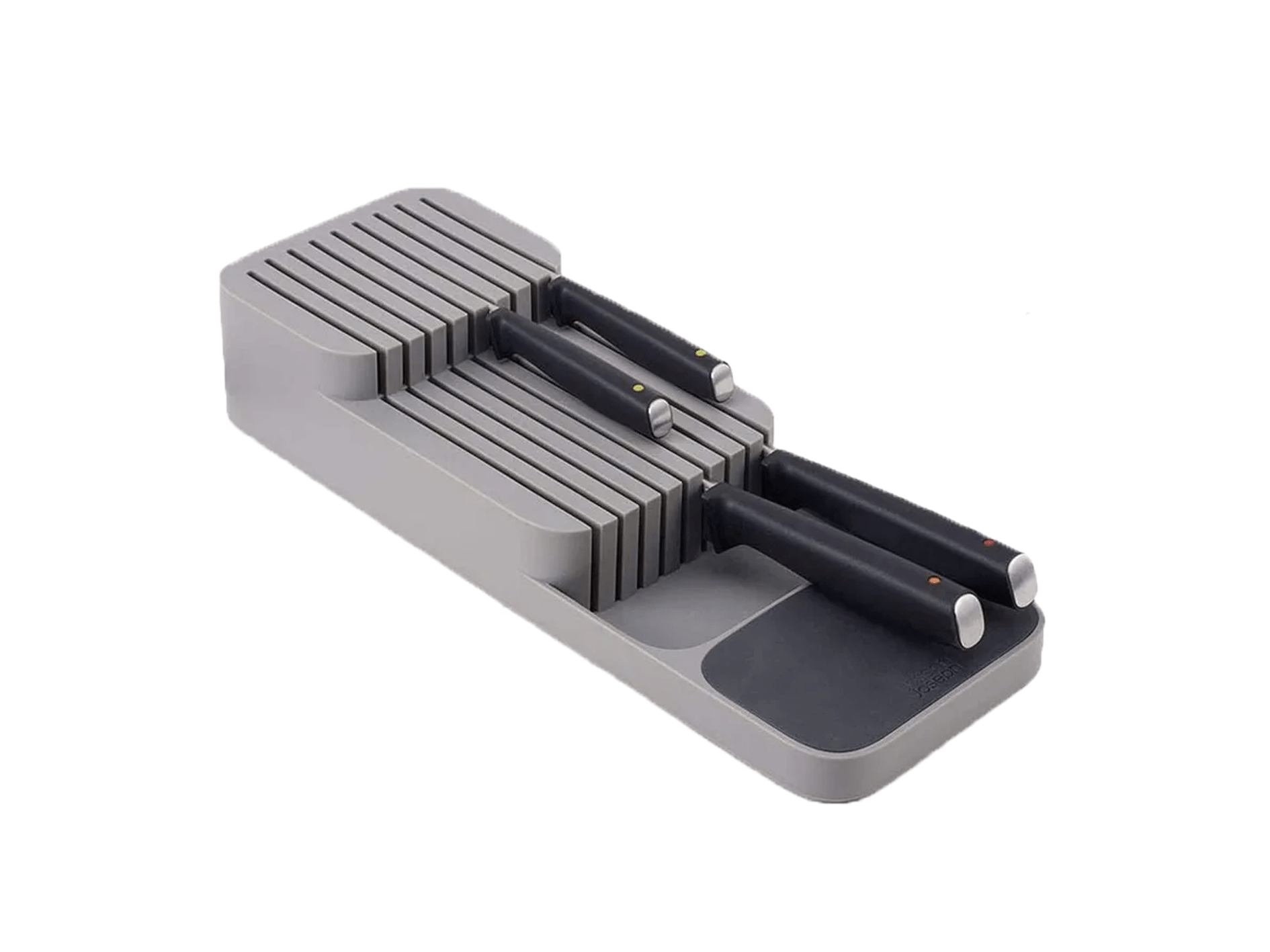 Denna eleganta design maximerar inte bara lådutrymmet utan förhöjer även kökets utseende, och erbjuder ett säkert och stilfullt sätt att hålla dina knivar i perfekt ordning.